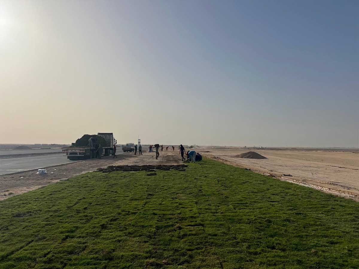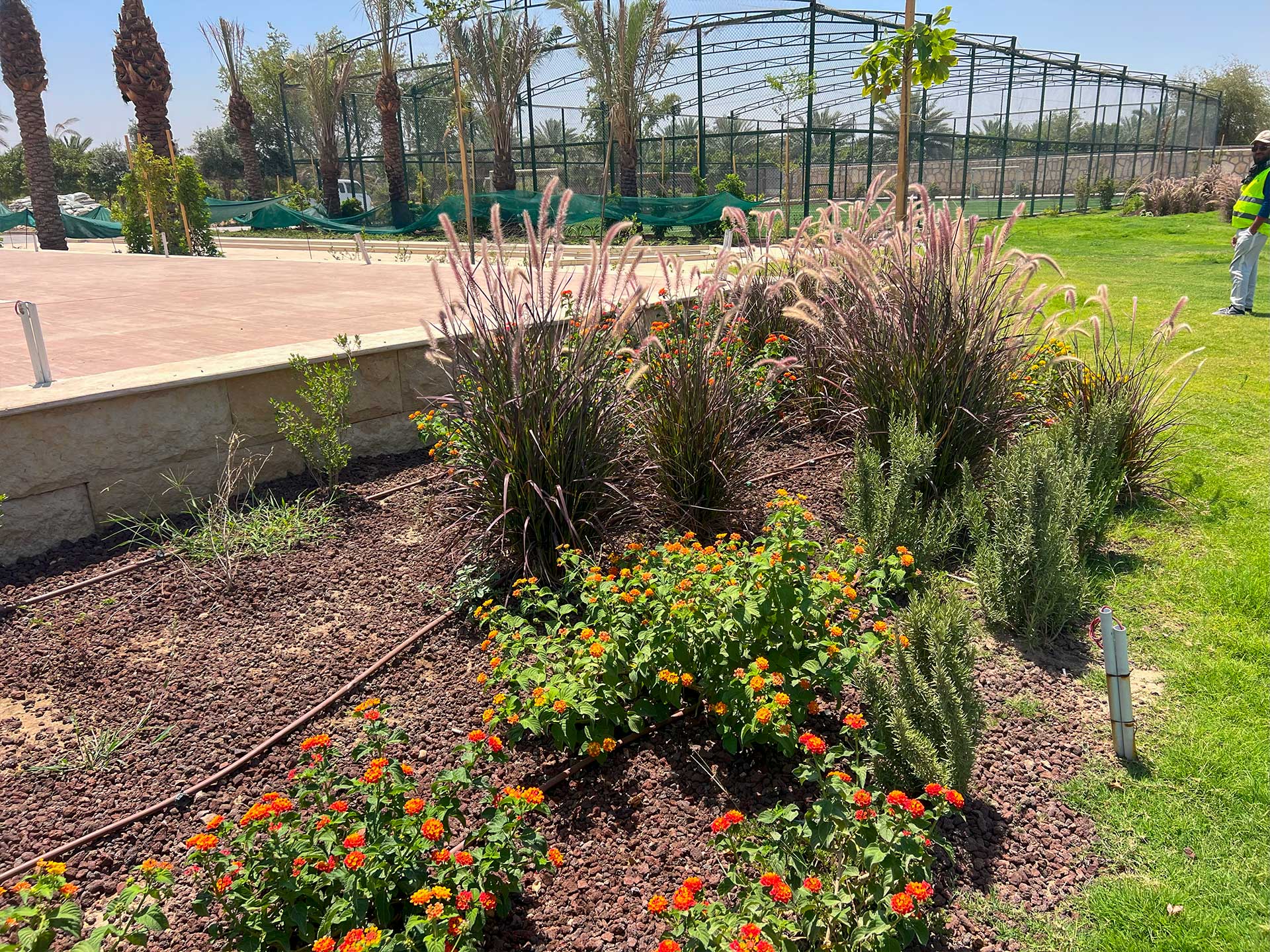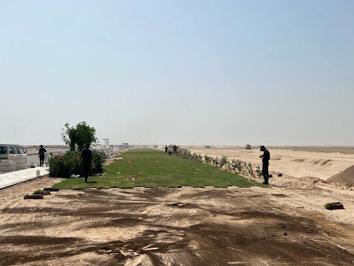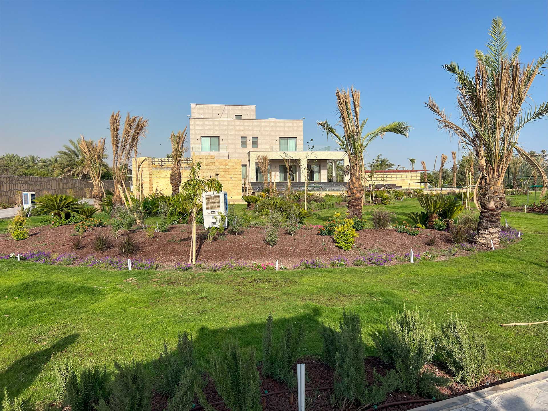 تسوية وتمهيد، ري ذكي بالتنقيط، مصارف مياه، مماشي بلاطات، ثيل، شجيرات محلية، تحسين تربة—مصمم لظروف الصحراء، استهلاك مائي منخفض، عمر أطول.
