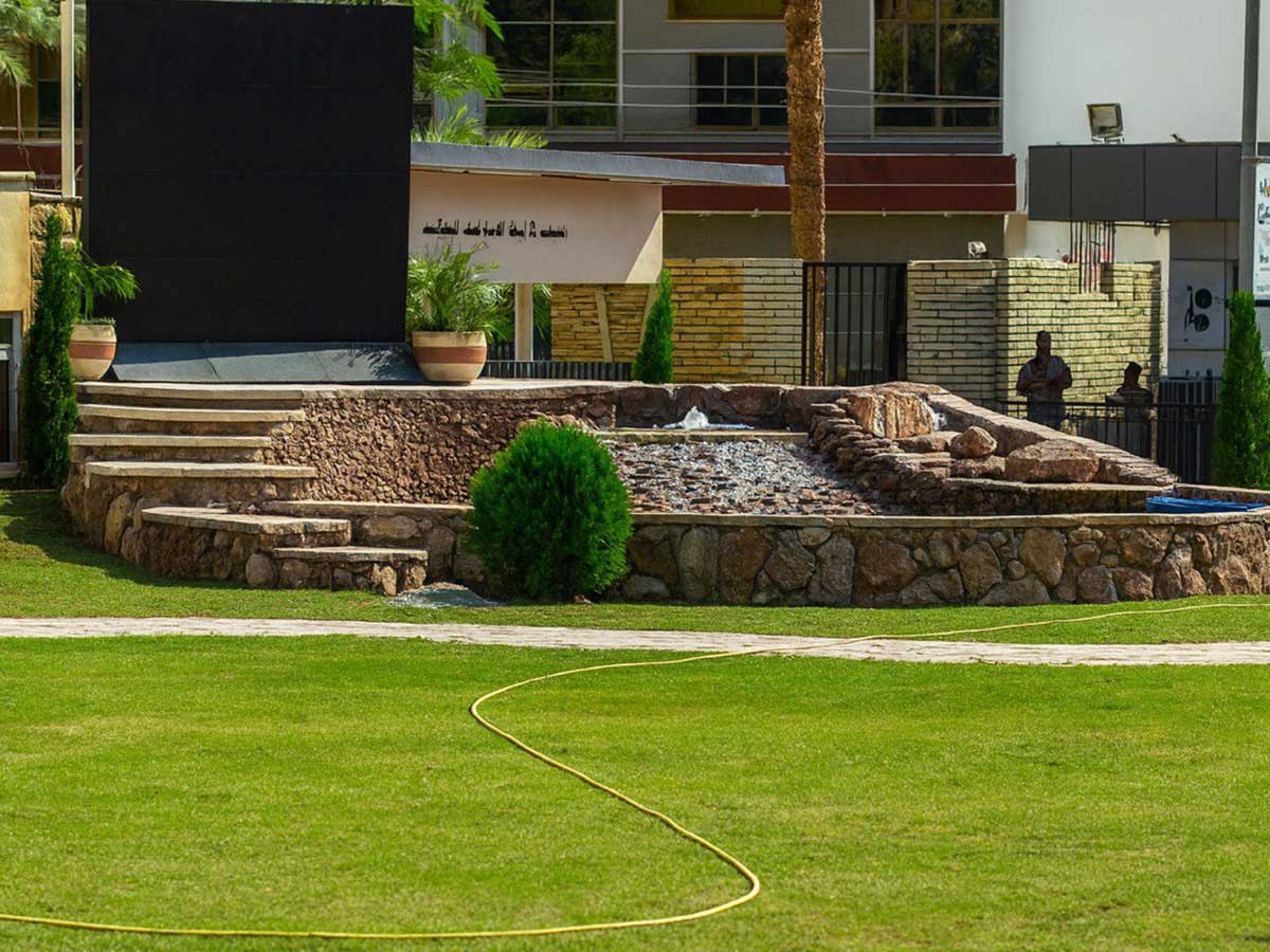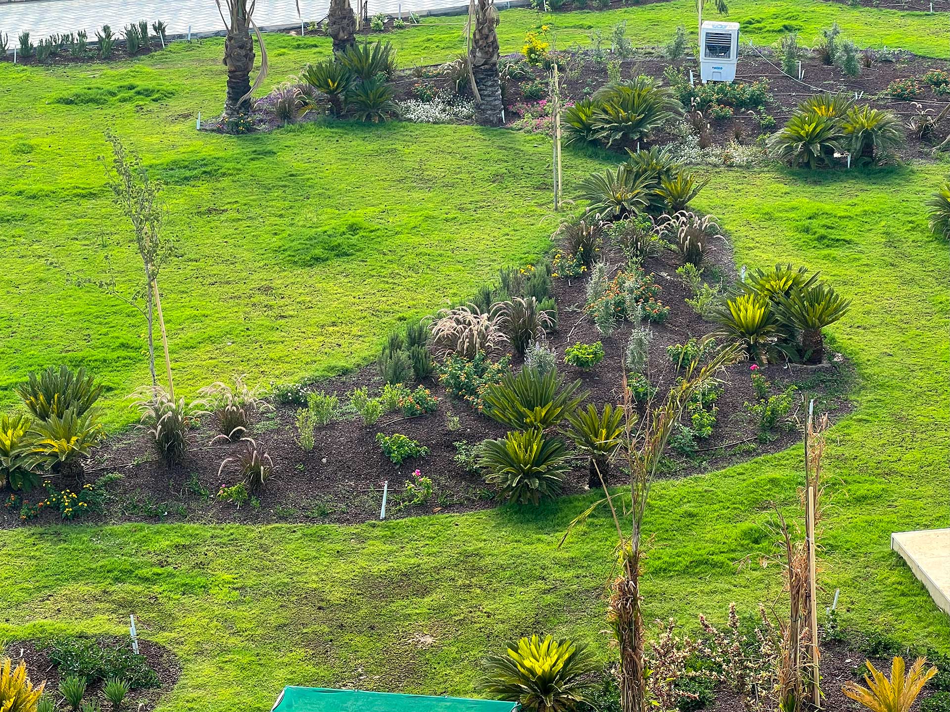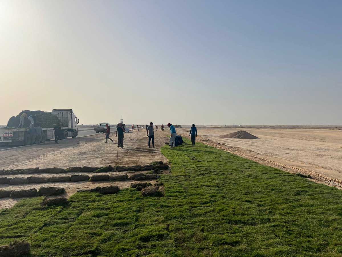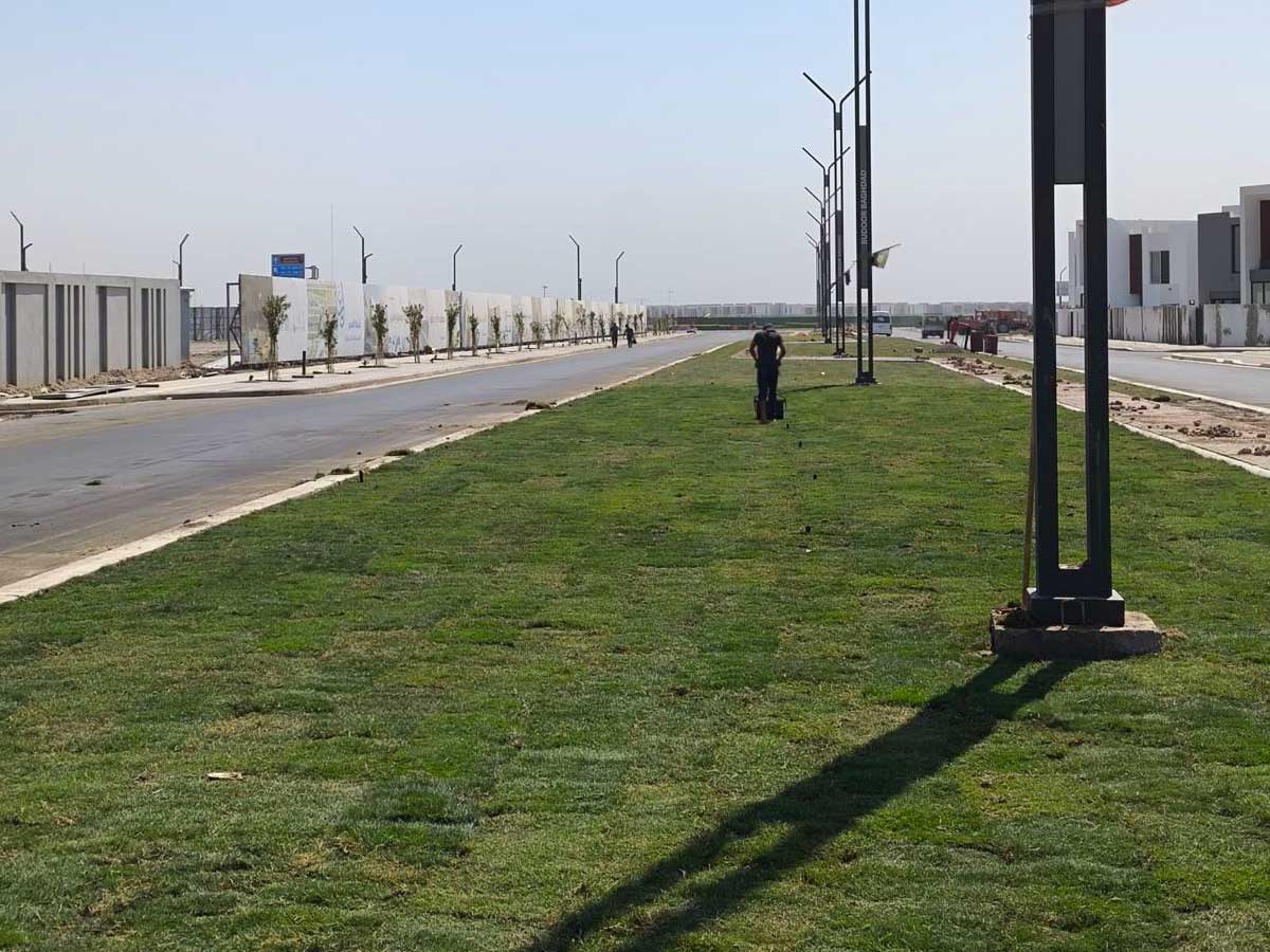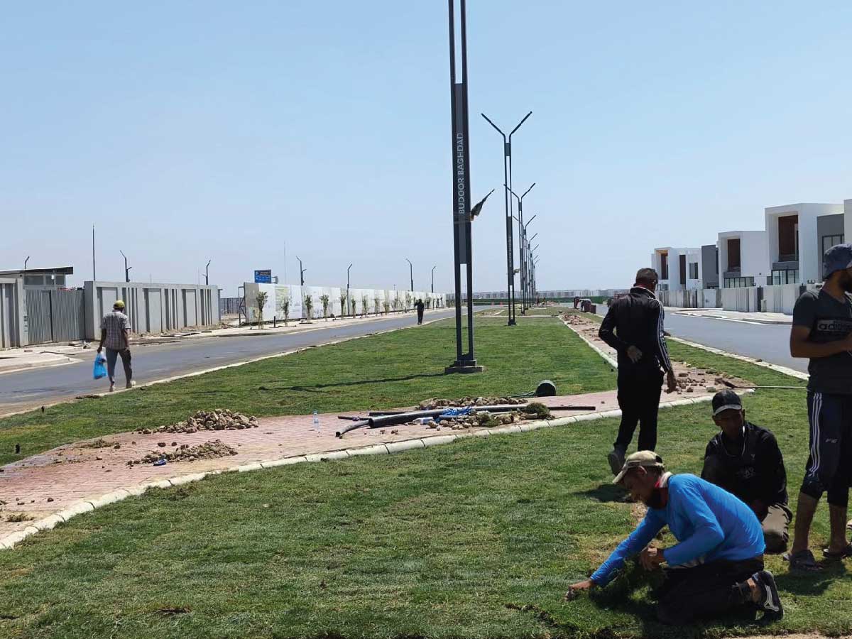 تسوية وتمهيد، ري ذكي بالتنقيط، مصارف مياه، مماشي بلاطات، ثيل، شجيرات محلية، تحسين تربة—مصمم لظروف الصحراء، استهلاك مائي منخفض، عمر أطول.