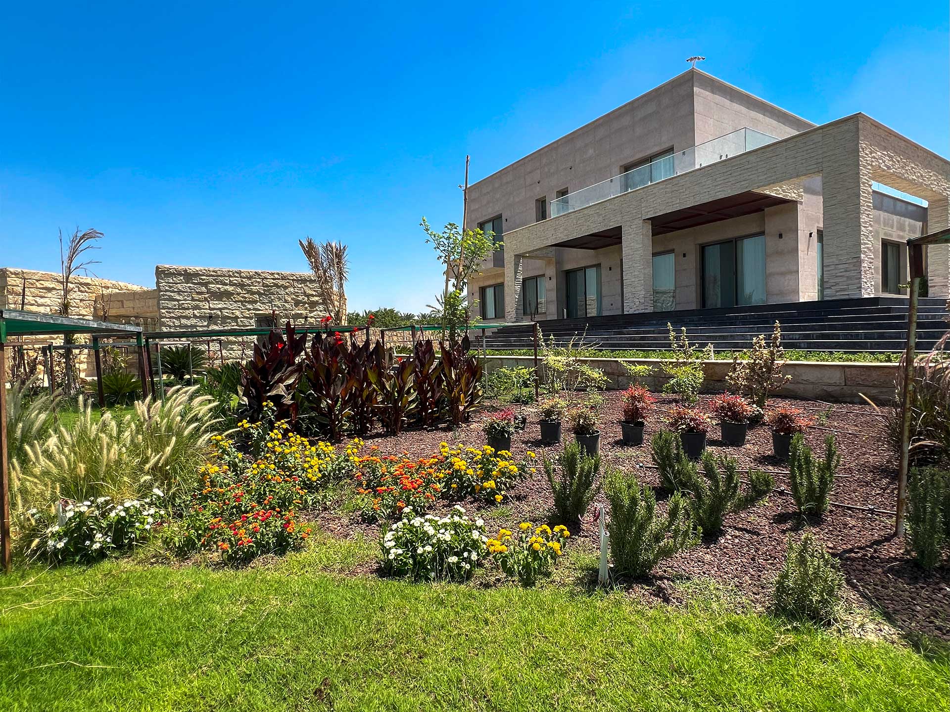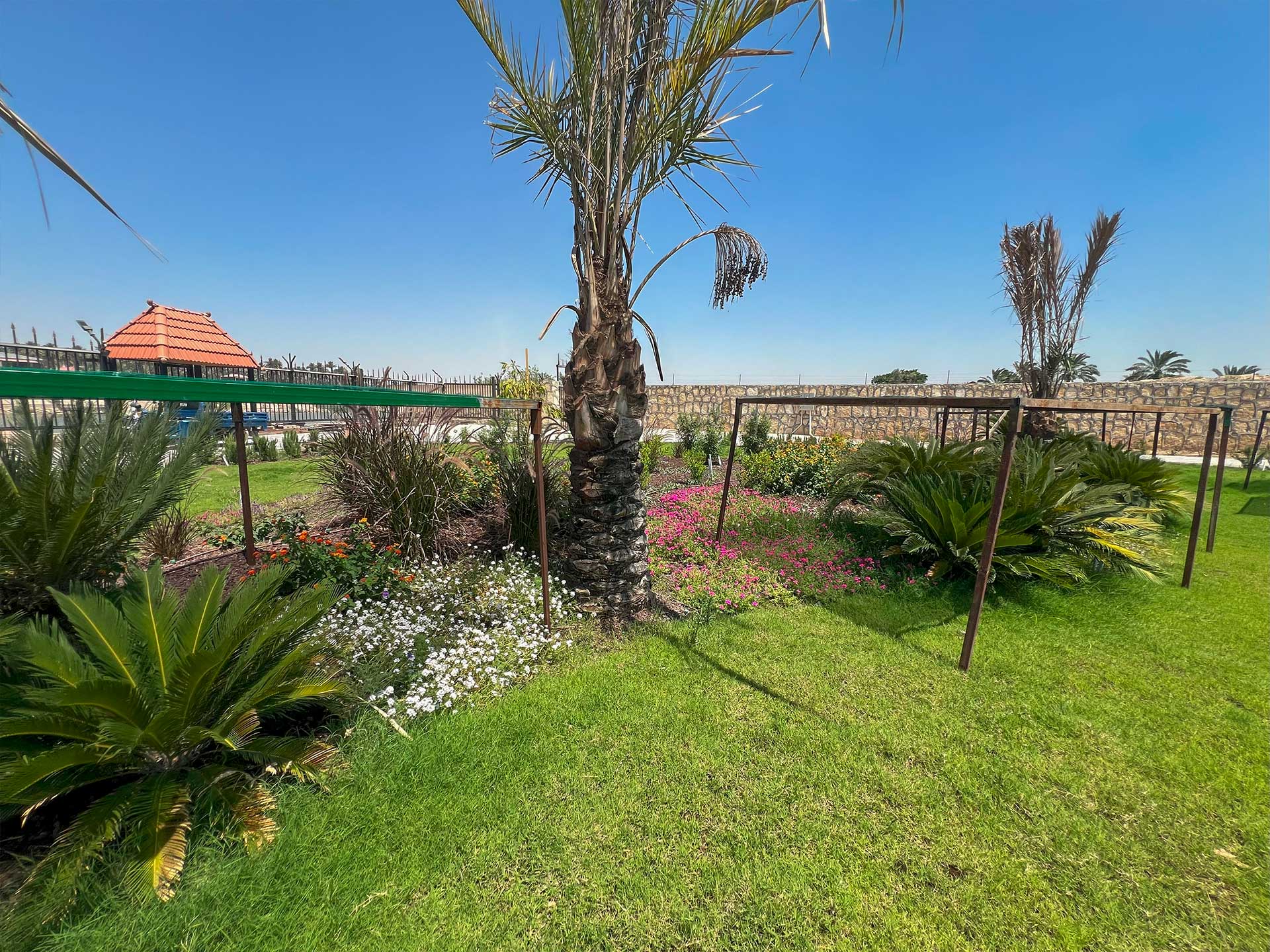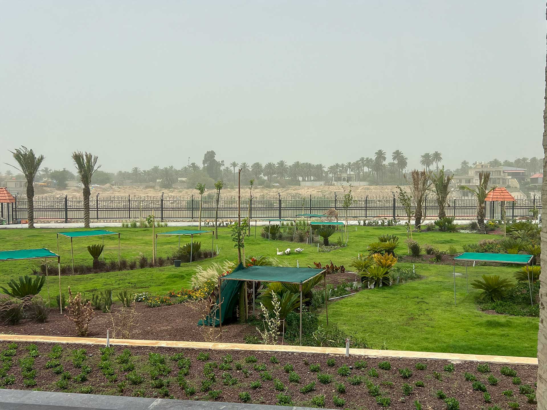 تمت دراسة تصميم المزرعة وتنفيذه باختيار نباتات ملائمة لظروف الموقع البيئية. أعددنا تقارير مناخية وبيئية، وفحصنا التربة ومعالجتها بمحسّنات مناسبة، مع تصميم منظومة ري وفق أسس علمية وحساب الاحتياجات المائية لكل نوع نبات. كما طبّقنا برنامج مكافحة متكاملة للآفات (IPM) لمزرعة الفواكه ونخيل التمر، وبرنامج تسميد دوري، مع تكامل منظومة الري للمساحات الخلفية من الموقع.