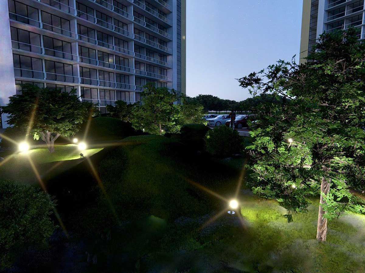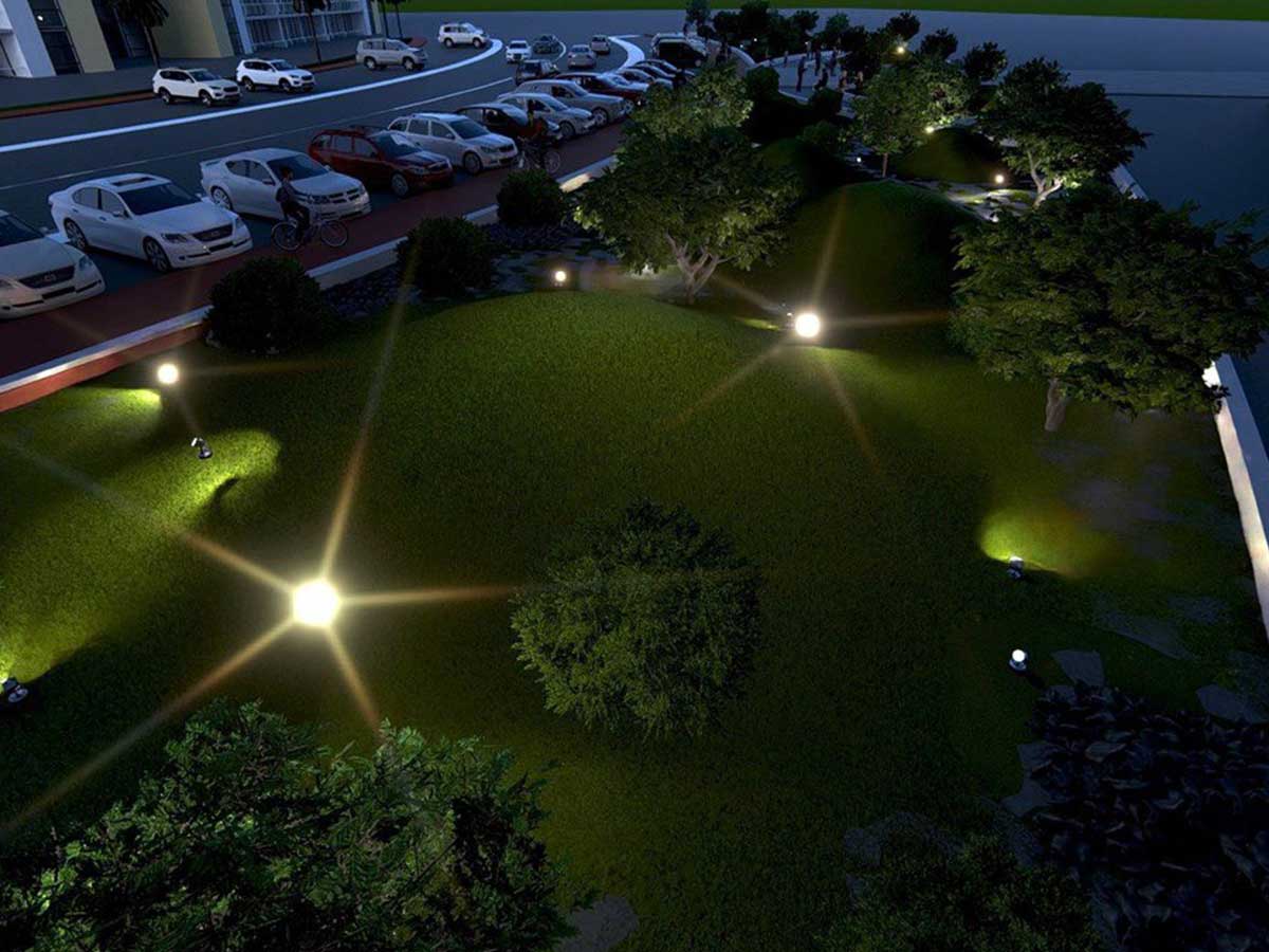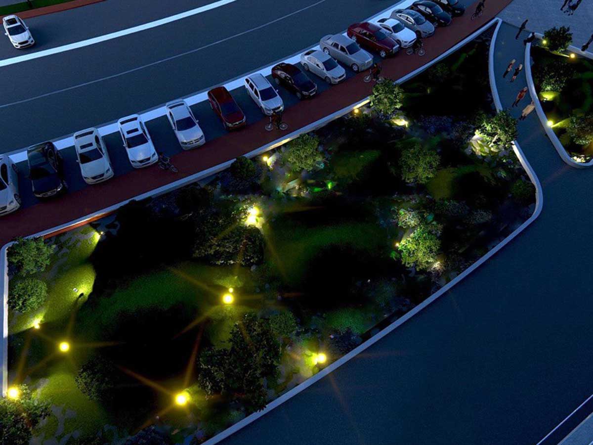 تنسيق حدائق حديثة للمجمع التجاري والسكني مع أنظمة موفرة للطاقة.